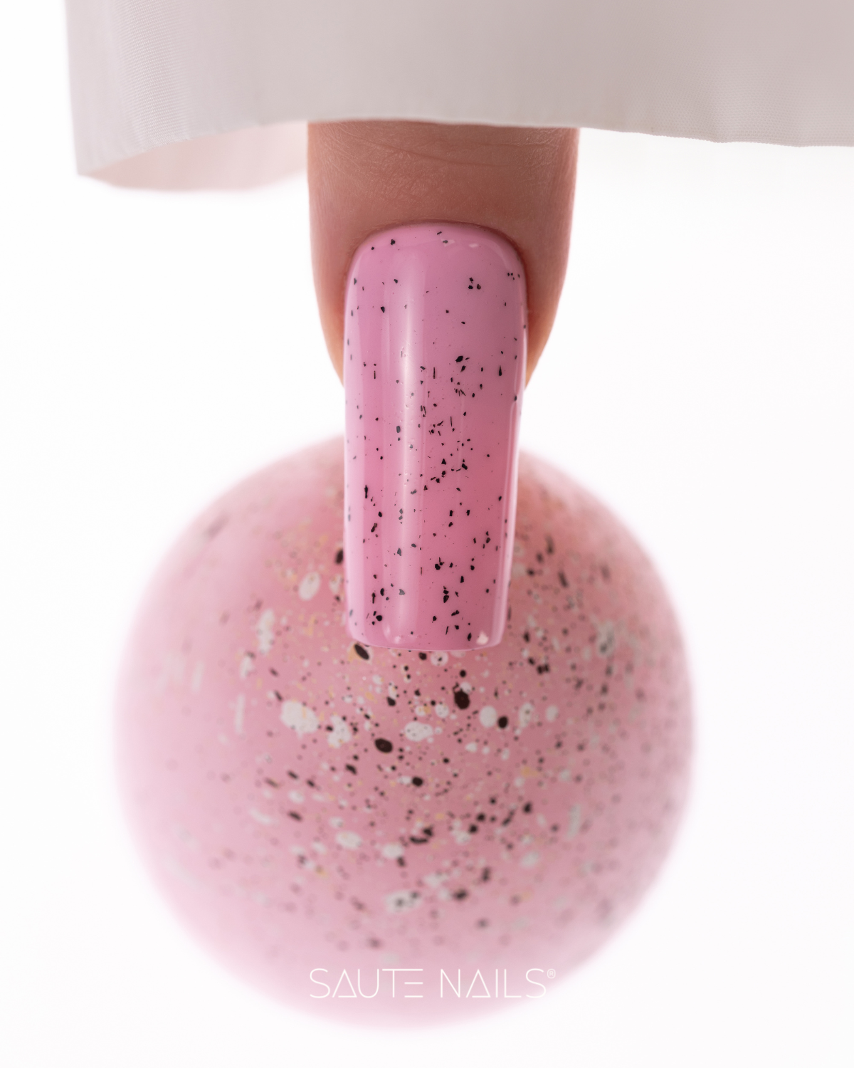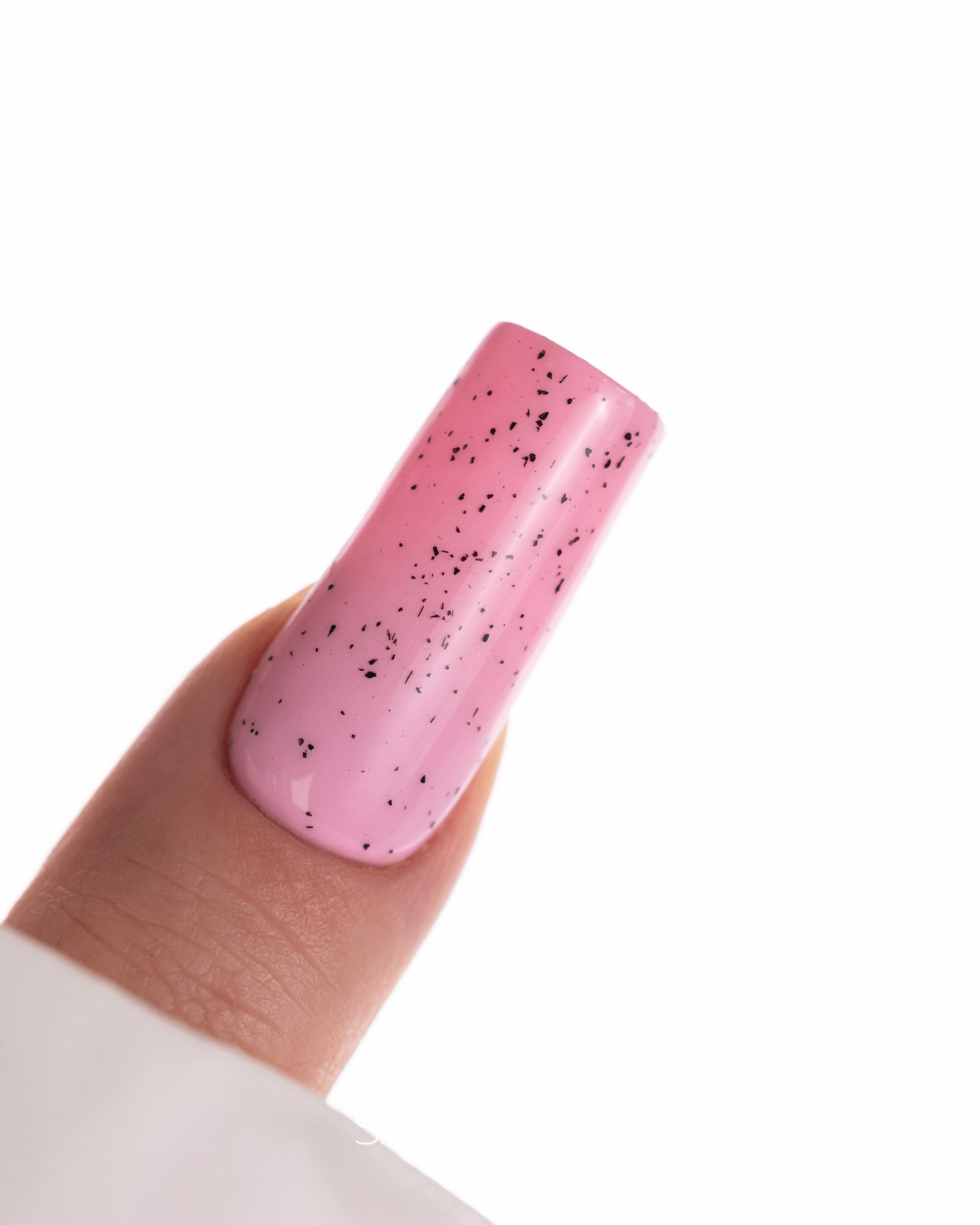Top zawiera nieregularne czarne drobinki, które tworzą charakterystyczny efekt „eggshell”. Delikatny, dekoracyjny akcent sprawia, że stylizacja nabiera nowoczesnego wyglądu, jednocześnie pozostając subtelną i spójną z bazowym kolorem.