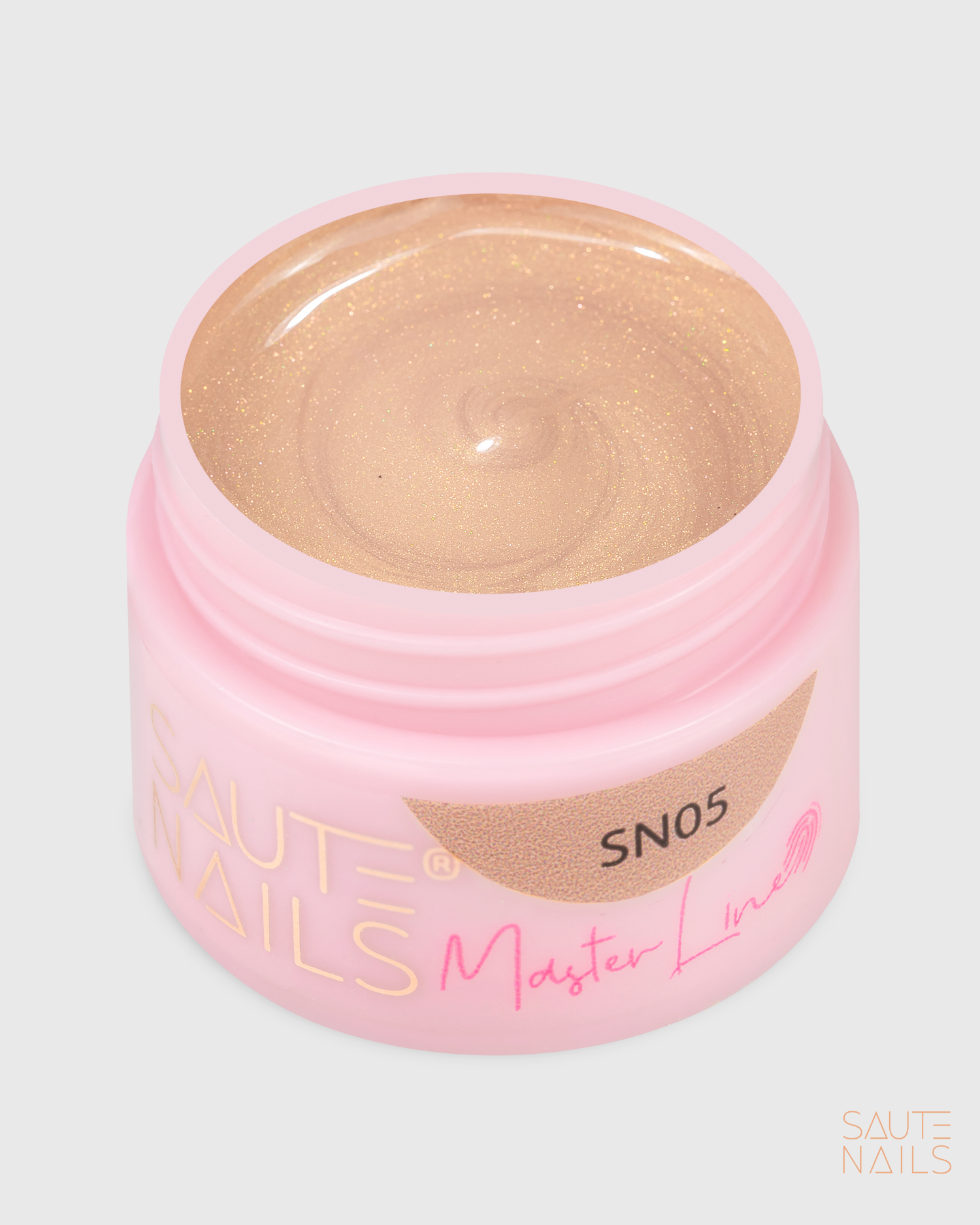 Saute Nails Master Line SN05 to kolorowy żel w odcieniu beżu z dodatkiem mieniącej się drobiny. Przepiękna i nietuzinkowa propozycja do zdobień!
